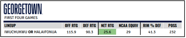 In the dog days of summer and in the lead-in to GLOBL Jam in Canada, Gideon and I made it pretty clear that the biggest question mark on this roster was likely the quality of the Center rotation. In the first four games of the season – with a healthy Vince Iwuchukwu and Julius Halaifonua – that seemed to not be the case. The two offered a yin and yang compliment to each other, with Halaifonua the finesse offensive hub and Iwuchukwu the rangy long defensive anchor. In the four games both were available, the Hoyas posted a +25.6 NetRtg (an adjusted metric to estimate net point advantage per 100 possessions against an average NCAA team), equivalent to 29th in the country, in the 232 possessions either one of Iwuchukwu or Halaifonua were on the floor. The pair had a collective DefRtg (an adjusted metric to estimate points per 100 possessions allowed) of 90.3, a miniscule number, that confirmed what we thought after George Washington and Kentucky scrimmages – that the Hoyas had a defensive first identity.