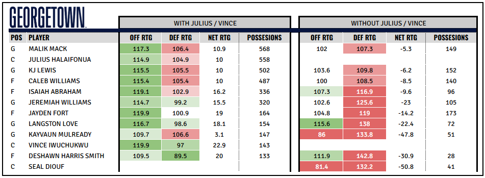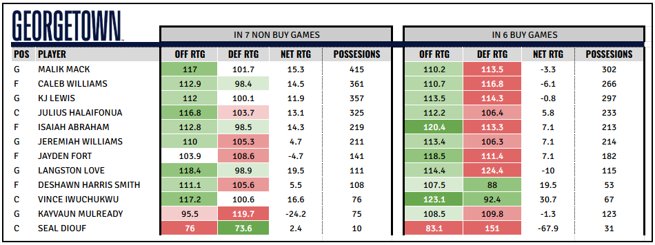 It’s quite clear the Hoyas couldn’t afford to need to turn to a third or fourth center this often (211 possessions). In those 211 possessions, they’ve sported a -17.9 NetRtg (equivalent to 316 in NCAA) compared to a respectable +12.6 rating when Vince or Julius is in the game. The discrepancy shrinks when isolated to the seven “non-Buy games” (a 19.5 Pts/100 difference) but it’s still so substantial that it has knee-capped both their floor and ceiling as a group. Every player on the team is markedly better with one of the two on the floor and only Kauvaun Mulready has a NetRtg less than +10 alongside one of them.