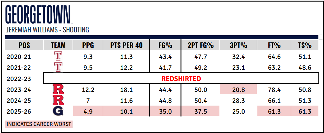On Jeremiah Williams, I’ve been pretty disappointed. He came on board as a veteran leader type with a plethora of experience (74 career starts across Temple and Rutgers). What they needed from him was going to be responsible play on the offensive side of the ball and a pitbull mentality on the defensive side of the ball. Over the course of GLOBL Jam and the two exhibitions he displayed that. Over that stretch (exhibitions I know) he shot 18-35 from the field (51.4%), 14-23 from 2-pt range (60.8%), and 4-12 from 3 (33.3%). In the two exhibitions vs George Washington and Kentucky, he was great defensively at the point of attack. In his 42 minutes he was a +17 and the Hoyas allowed (a self charted) 0.89 points per possession in his 77 possessions. Conversely, in the regular season, he’s been extremely inefficient attempting to score the basketball and his defensive numbers have not been too impactful. I’m listing his shooting numbers below but he’s posted career worsts in FG%, 2 point FG% and True Shooting % (by a significant margin) as well as in FT%. No more was his inefficiency on display than in the close Xavier loss in which he ended 10 possessions via shot, turnover, and drawn foul … to the tune of 3 total points.