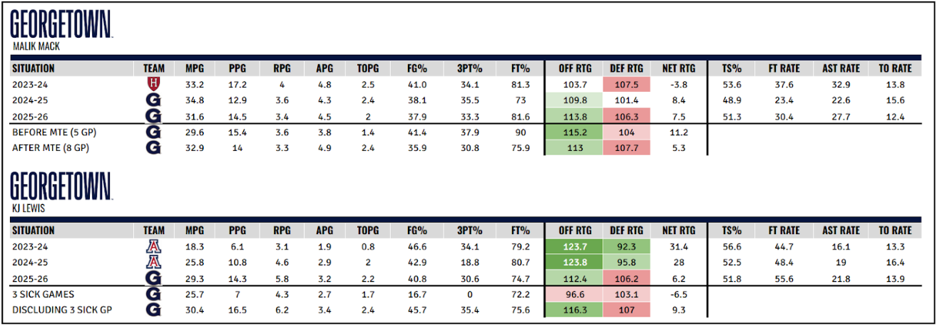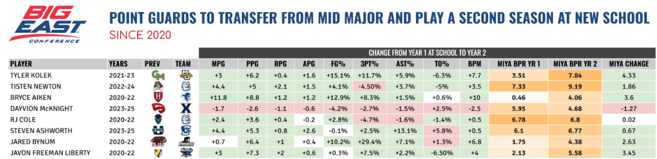 The good news is that the Hoyas do have a real starting backcourt between Malik Mack and KJ Lewis, who have been mostly good albeit probably not one of the best backcourts in the country as Ed Cooley has alluded to. On the Finger WAG, I alluded to Mack’s need for progression in essentially all aspects of the game – shooting efficiency, facilitating, and just general physicality. I also noted that in recent Big East history, most Point Guards that made the jump from Mid-Major hoops made their most significant jump in their second year at the level.