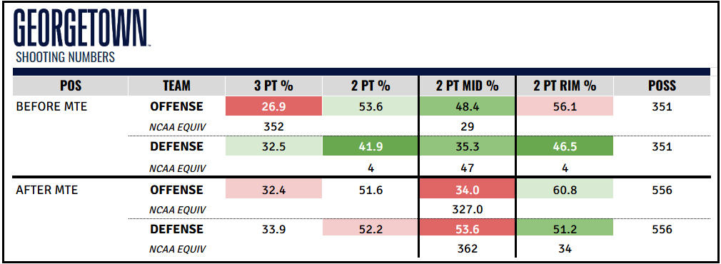 His departure marked a change in the Hoyas, who promptly lost their defensive efficiency and became painfully undermanned in the frontcourt. Since then, the Hoyas have gone 5-4 with a record of 1-4 in “non-buy games”, with the only win coming against KenPom #115 Marquette (who are 0-7 in “non-buy games”). Over that stretch, the team’s NetRtg has been +4.3, equivalent to 132rd in the country, and its DefRtg has been a lousy 109.1, equivalent to the 202nd best defense in the country. Interestingly enough, the rim defense has remained stout allowing only 51.6% FG at the rim (40th in NCAA) but the team’s ability to defend the midrange has crumbled, allowing a 51.8% mark in the region (361 of 365 Div 1 teams) – more on that to come.