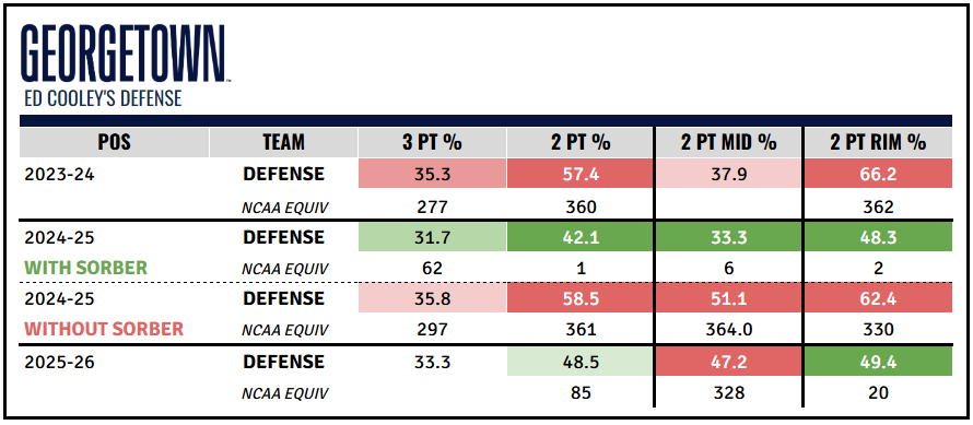 I also think it’s concerning that Cooley put together a decade of quality defenses at Providence but now at Georgetown, his only defensive solution over two and a half years has been Thomas Sorber. Take a look at this: